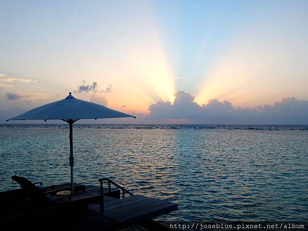 清晨陽光昇起時才真正見識到 One&Only Reethi Rah 長廣型水上屋帶來視覺震撼。